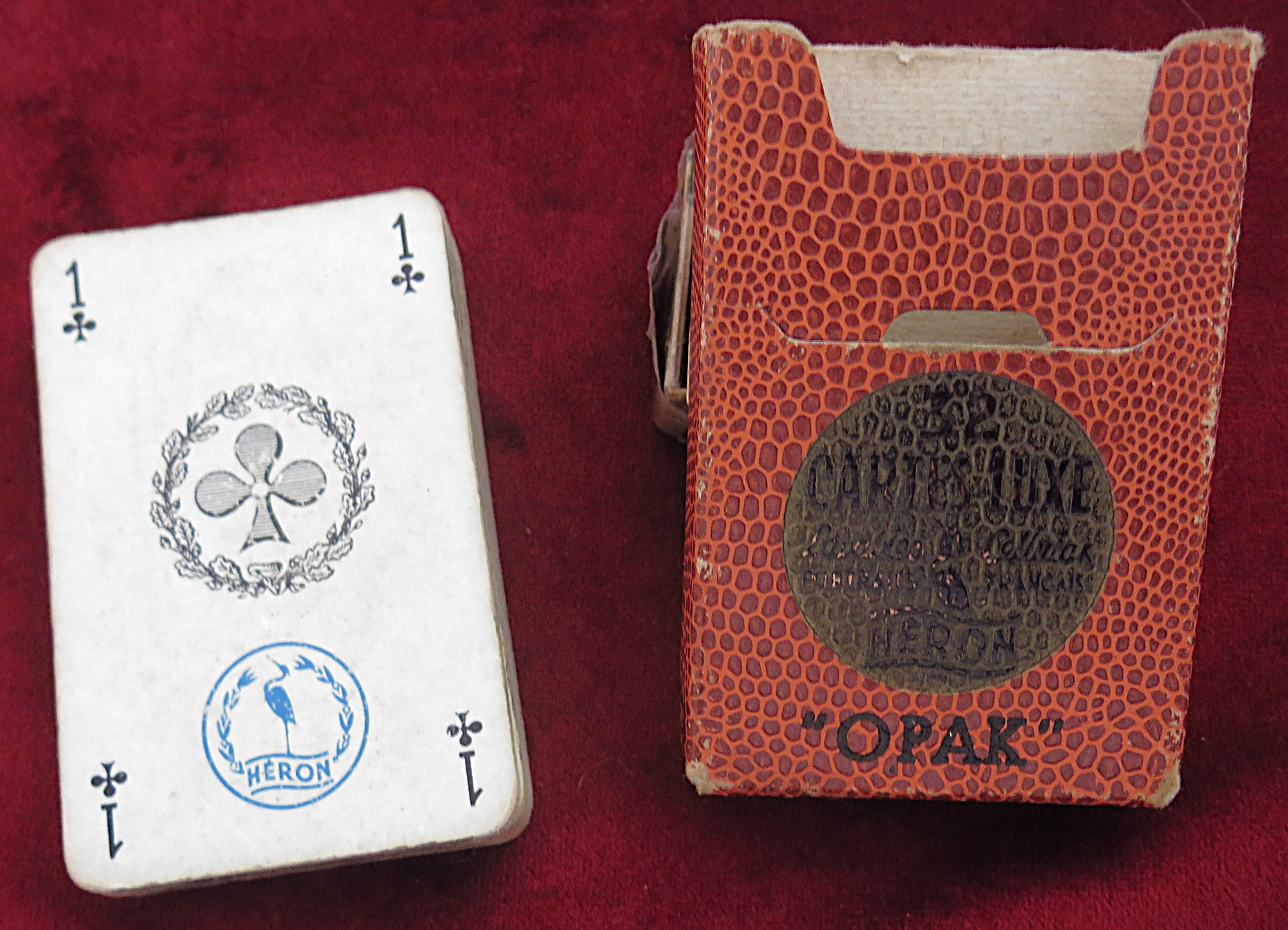 Une véritable curiosité pour les collectionneurs de cartes à jouer françaises et d'éditions Héron. Ces jeux miniatures « OPAK » comptaient parmi les plus beaux jeux de poche d'après-guerre, appréciés pour leur impression de haute qualité et leur boîte au motif texturé de lézard. De plus en plus rares en version complète.
