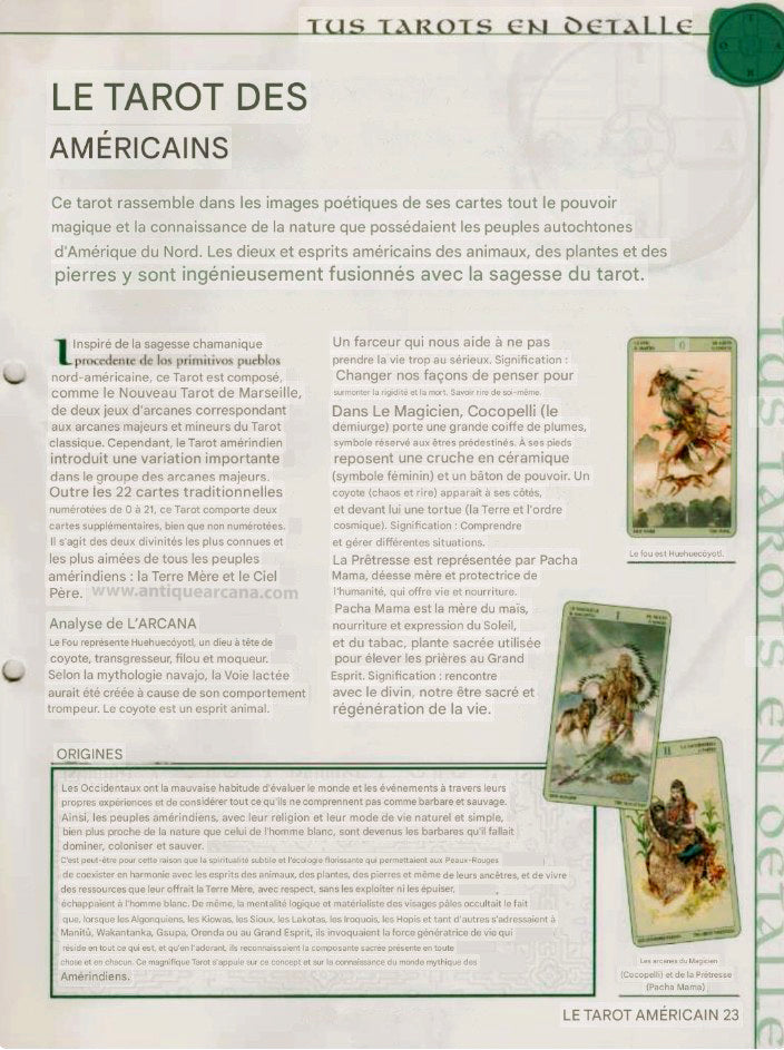 Ce tarot magnifique et culturel révèle en détail la richesse des anciennes traditions amérindiennes , de leurs colonies et de leur histoire. Chaque arcane est imprégné de douces tonalités terrestres, porteuses d'une profonde résonance émotionnelle et spirituelle. Il en résulte un tarot non seulement élégant, mais aussi profondément inspirant.