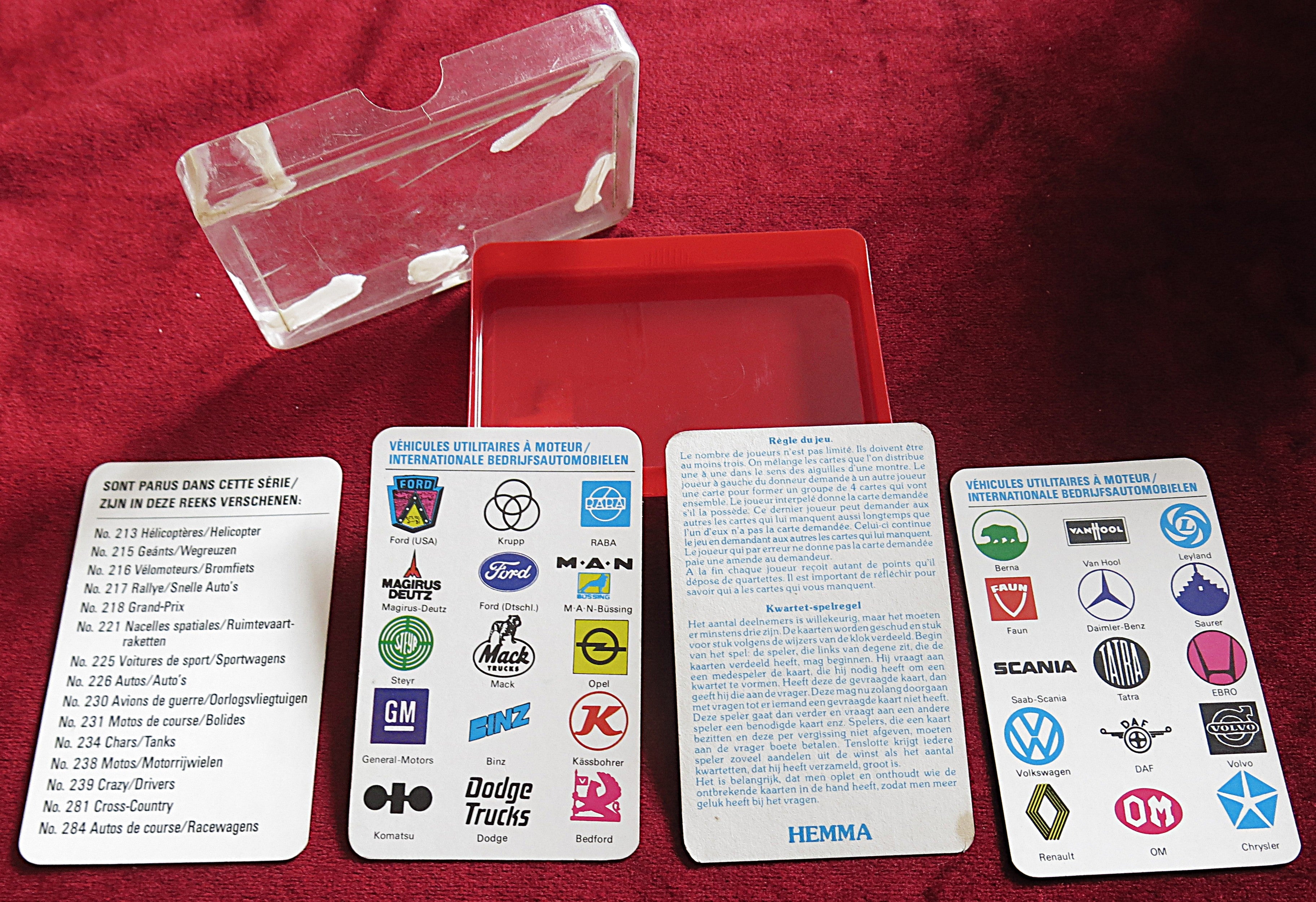 Super Quartett / Super Kwartet bilingue Benelux par FX Schmid (distribution Hemma), sur le thème des poids lourds et des véhicules utilitaires . Chaque carte indique les caractéristiques techniques (cylindrée, CV/PK, cylindres, vitesse maximale, longueur, charge utile) avec les drapeaux des pays. Parmi les marques, on trouve Renault, Scania, MAN, Leyland, International, VW, Daimler-Benz, Faun, Unimog et bien d'autres.