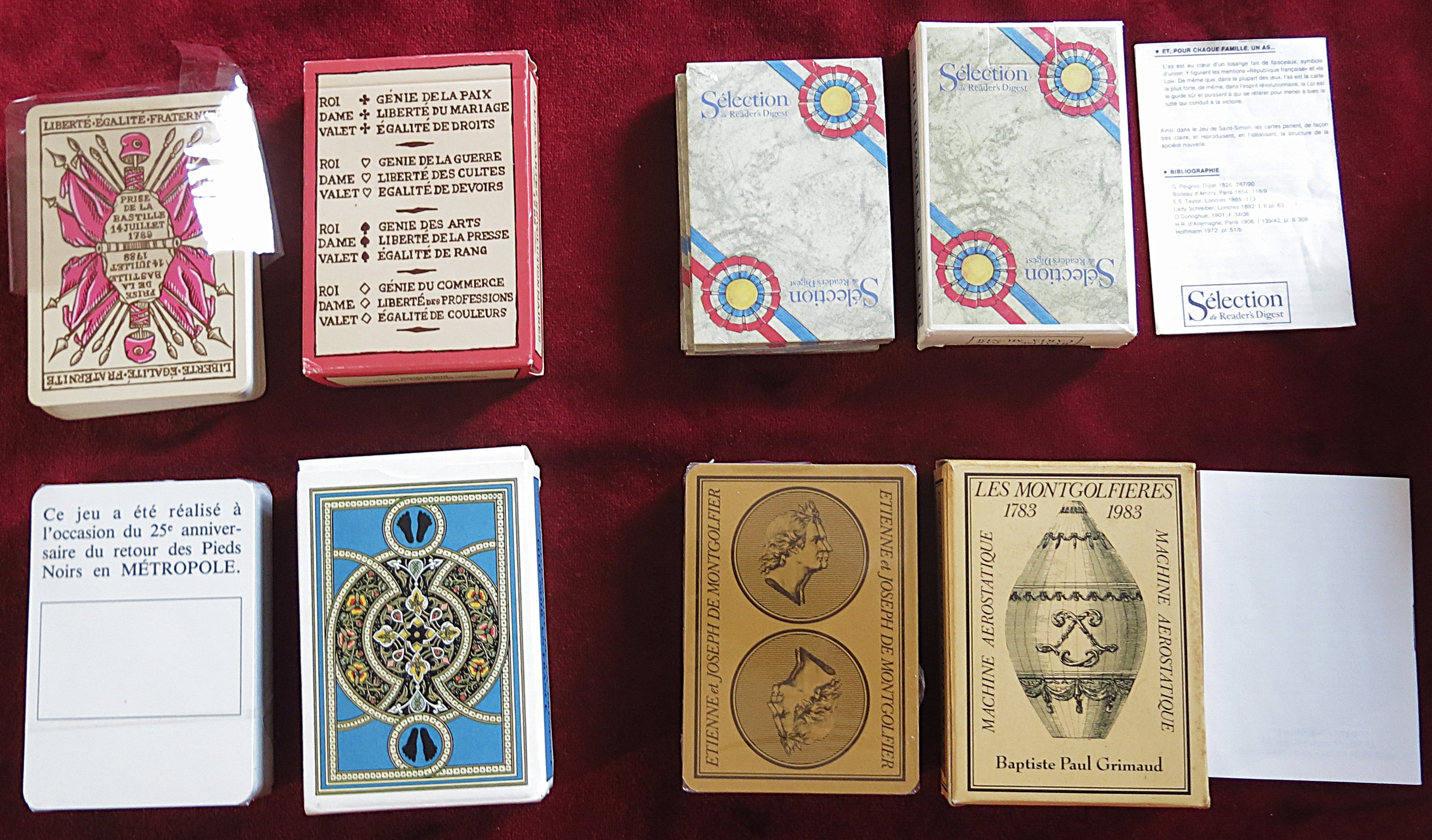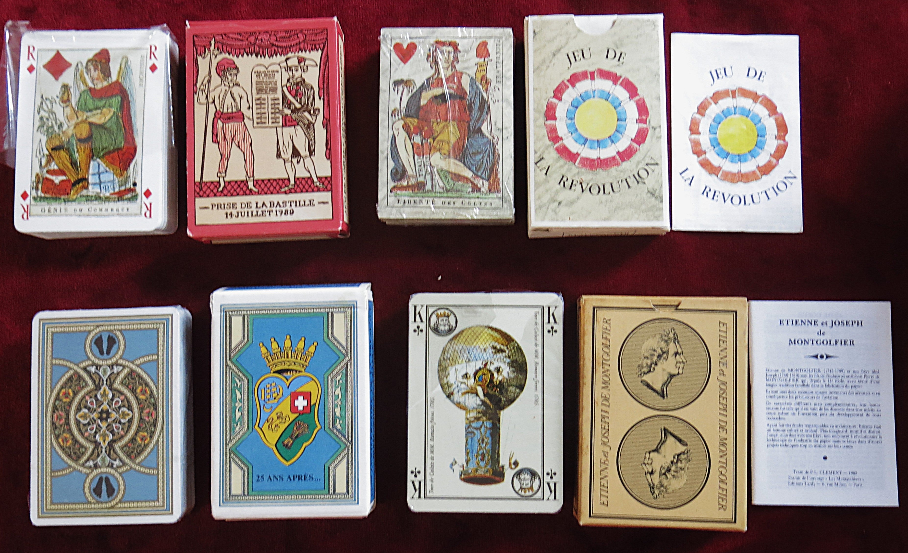 Une collection remarquable de quatre jeux de cartes historiques français célébrant des moments clés du patrimoine national français, du premier vol des frères Montgolfier aux idéaux de la Révolution. Chaque jeu, édité par Grimaud ou France Cartes , est un hommage artistique fidèle, imprimé dans les années 1980 avec la qualité raffinée typique des fabricants français.