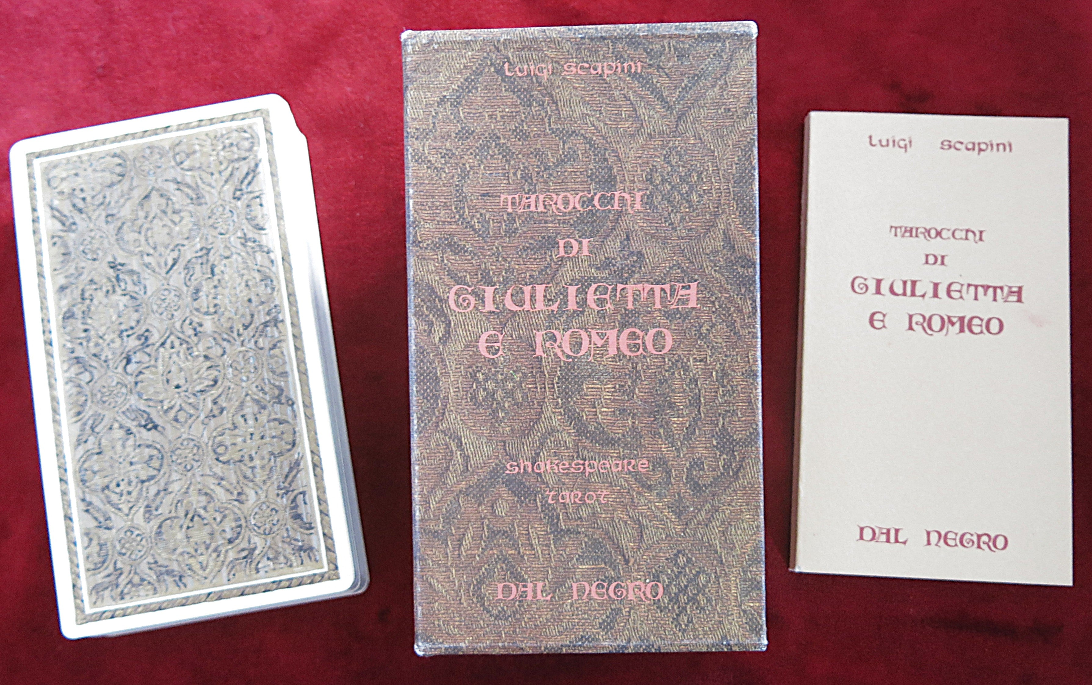 Ce magnifique jeu de tarot théâtral de Luigi Scapini donne vie à l'univers de Shakespeare, et plus particulièrement à la romance et à la tragédie de Roméo et Juliette . Richement illustré de scènes inspirées de la Renaissance et de bordures ornementées, ce jeu allie le symbolisme classique du tarot à la narration littéraire : un véritable trésor pour les collectionneurs.