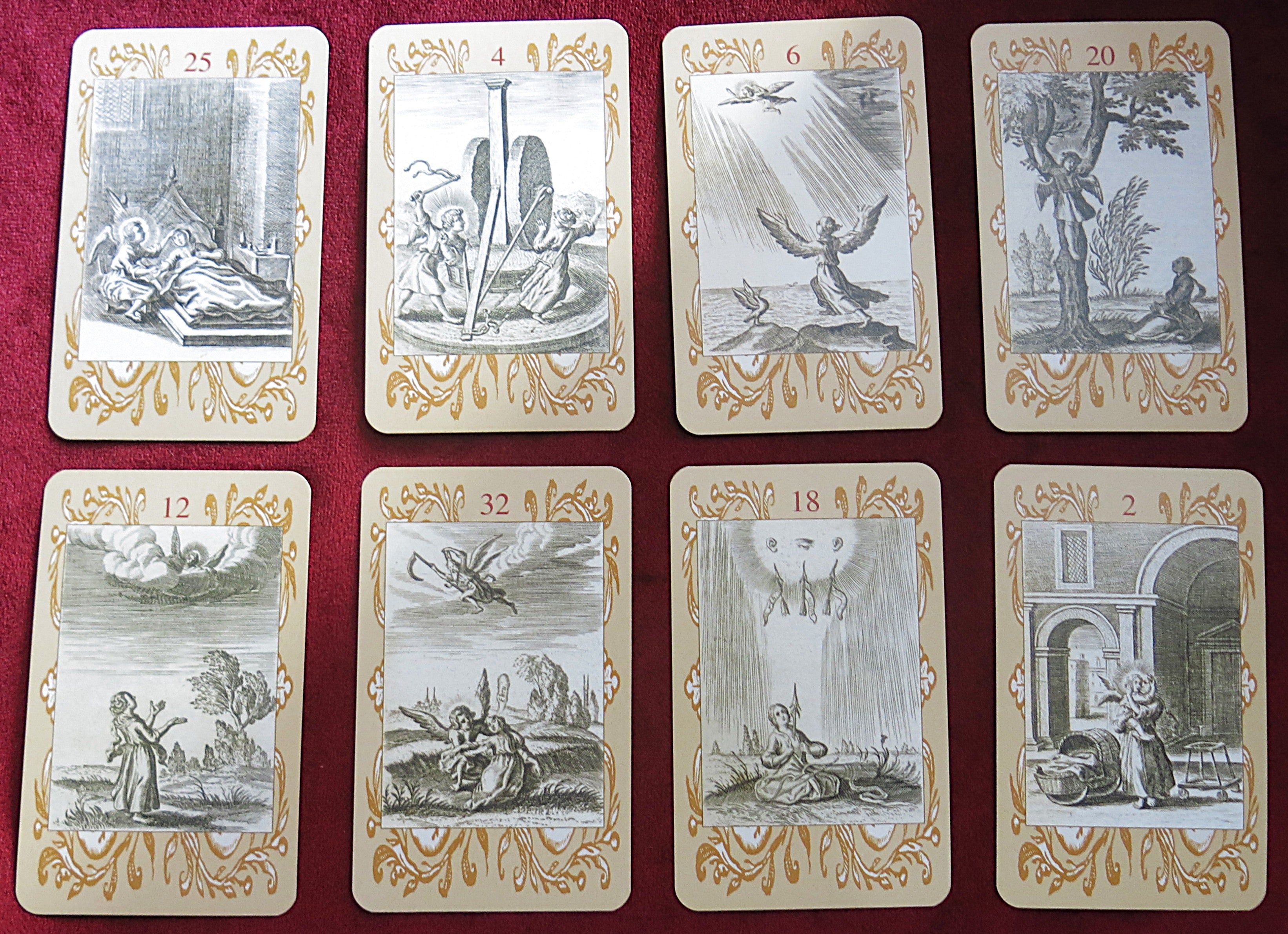 Chacune des 32 cartes présente une illustration aux tons sépia, inspirée des estampes dévotionnelles des XVIIIe et XIXe siècles : anges descendant du ciel, allégories morales, scènes de vertu et de vice, et figures mythiques engagées dans un dialogue spirituel. Il en résulte un oracle contemplatif à la fois intemporel et intime, idéal pour la méditation, la recherche de réponses et le travail intérieur.