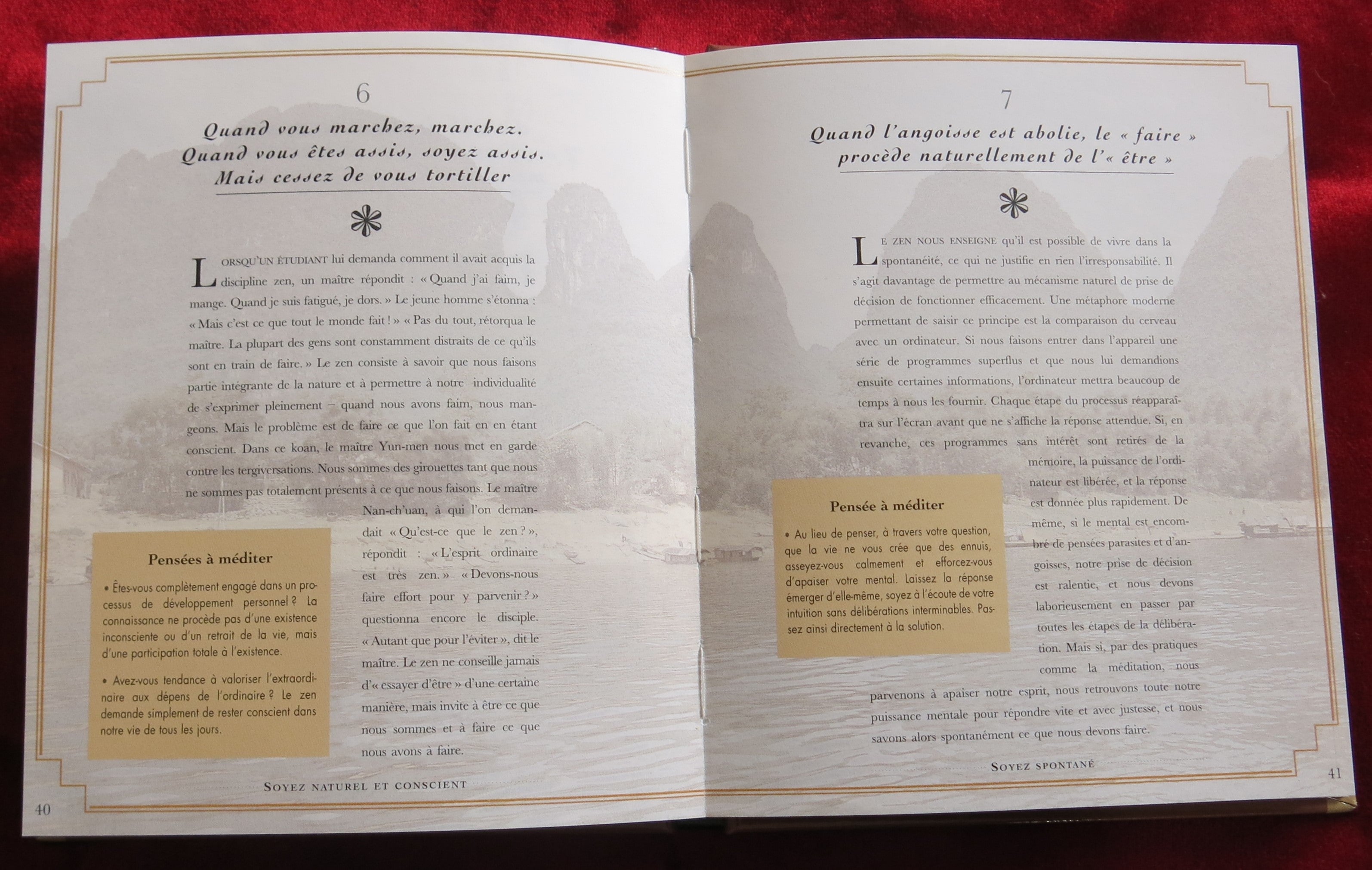 Chaque carte présente un précepte zen, tel que : « Quand tu marches, marche. Quand tu t’assieds, assieds-toi. Mais arrête de gigoter. » Le livre qui l’accompagne explique l’origine et l’interprétation de chaque koan, offrant ainsi un espace de réflexion et de pleine conscience au quotidien.