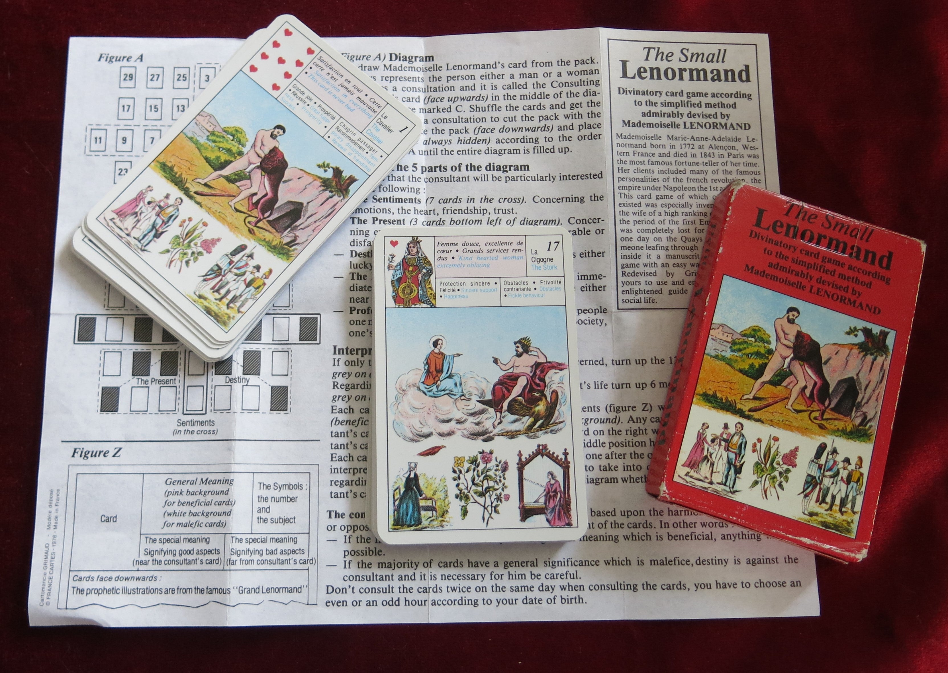 This Grimaud 1976 edition of The Small Lenormand (or Petit Lenormand) is a faithful reproduction of the 19th-century divination system designed in honor of the legendary seer Mlle Lenormand, advisor to Napoleon and Joséphine de Beauharnais.
