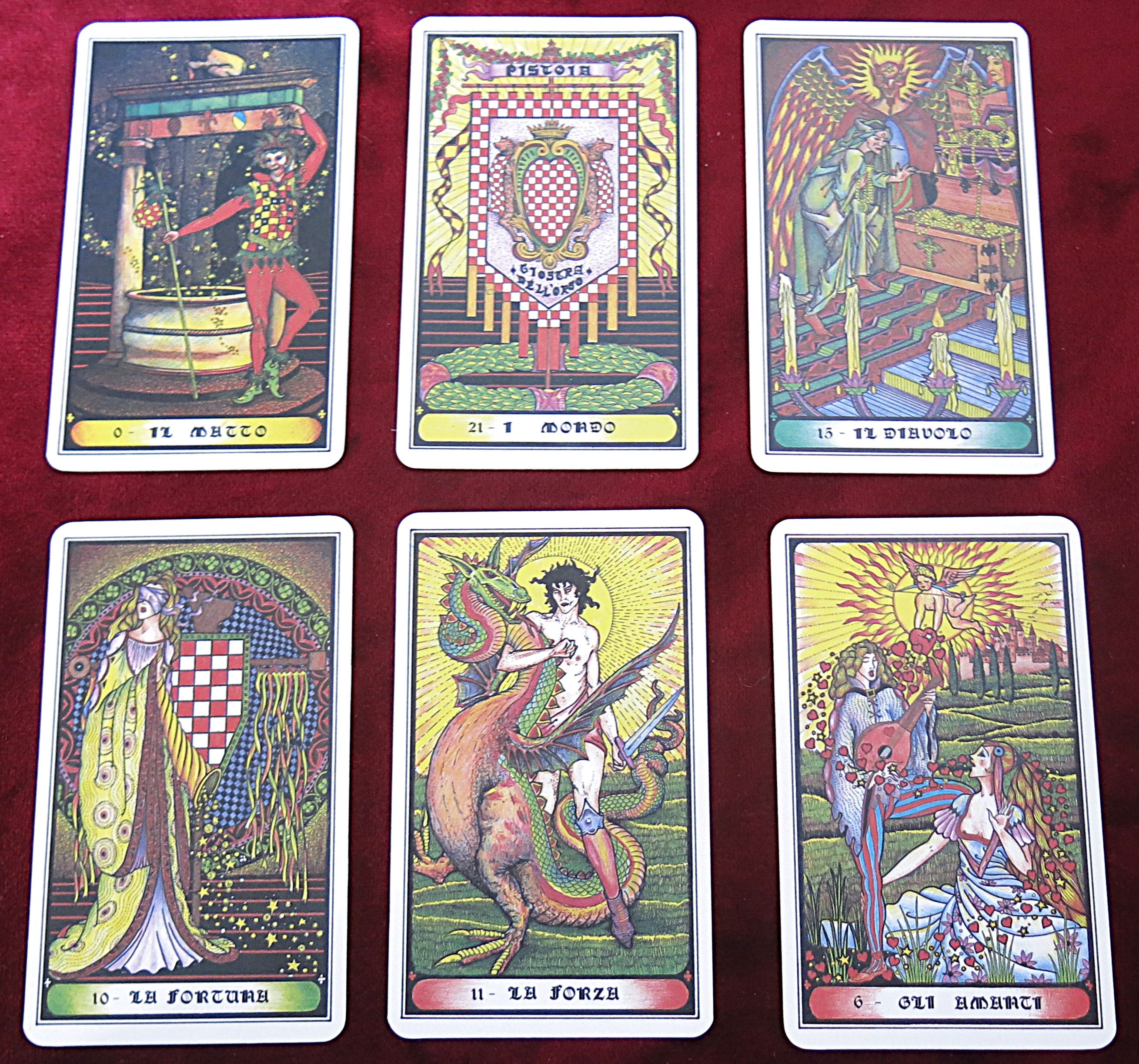 This rare and highly collectible tarot deck by Amerigo Folchi, published by Solleone in 1985, celebrates the historic city of Pistoia and its famous Palio (horse race). Each of the 79 cards is rich with medieval symbolism, heraldic motifs, and Folchi’s distinctive artistic flair, blending tradition with arcane poetry.