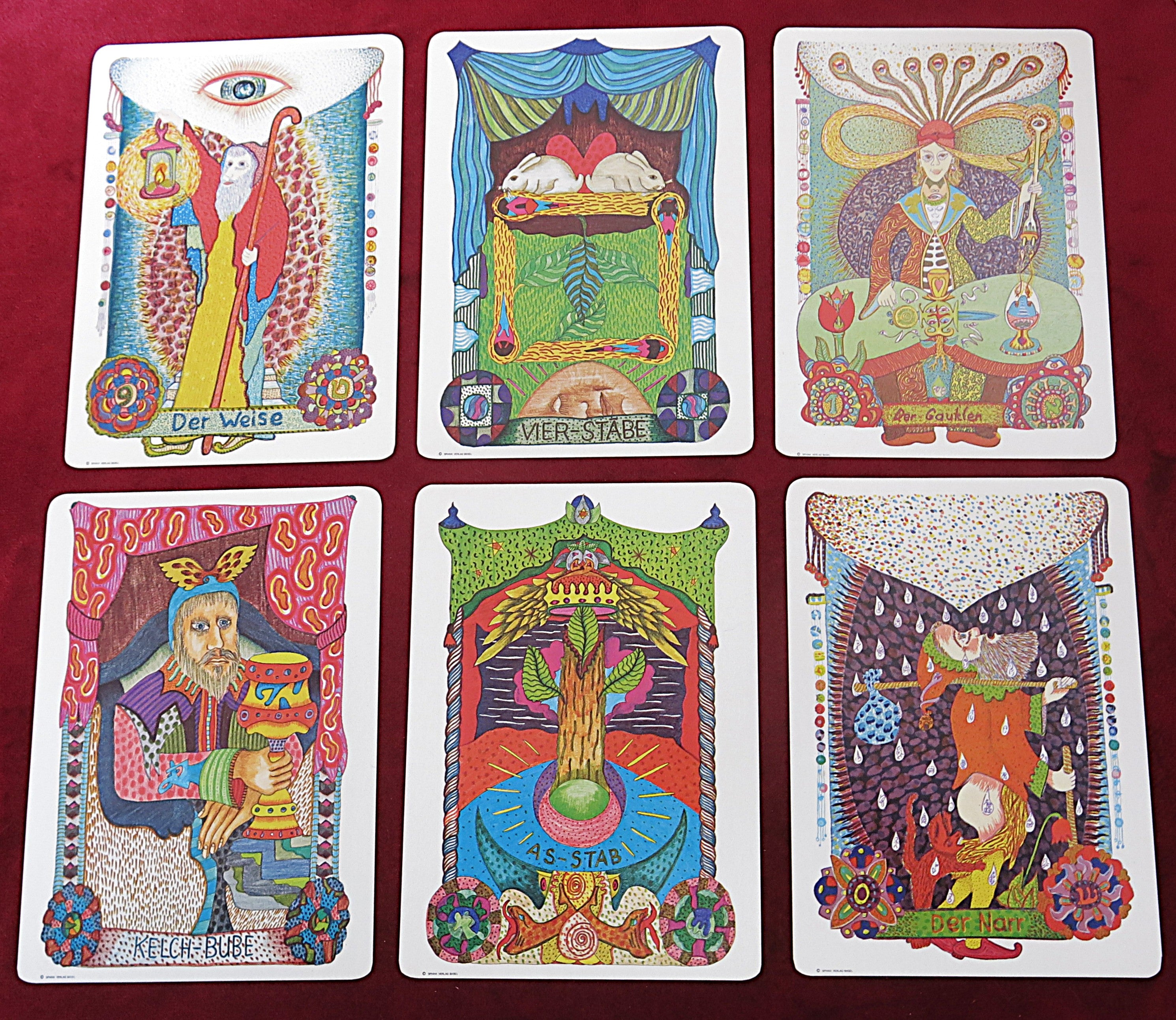 The cards feature German titles and exhibit Wegmüller’s unique psychedelic and visionary style, blending folk art and esoteric symbolism into a highly collectible tarot deck.